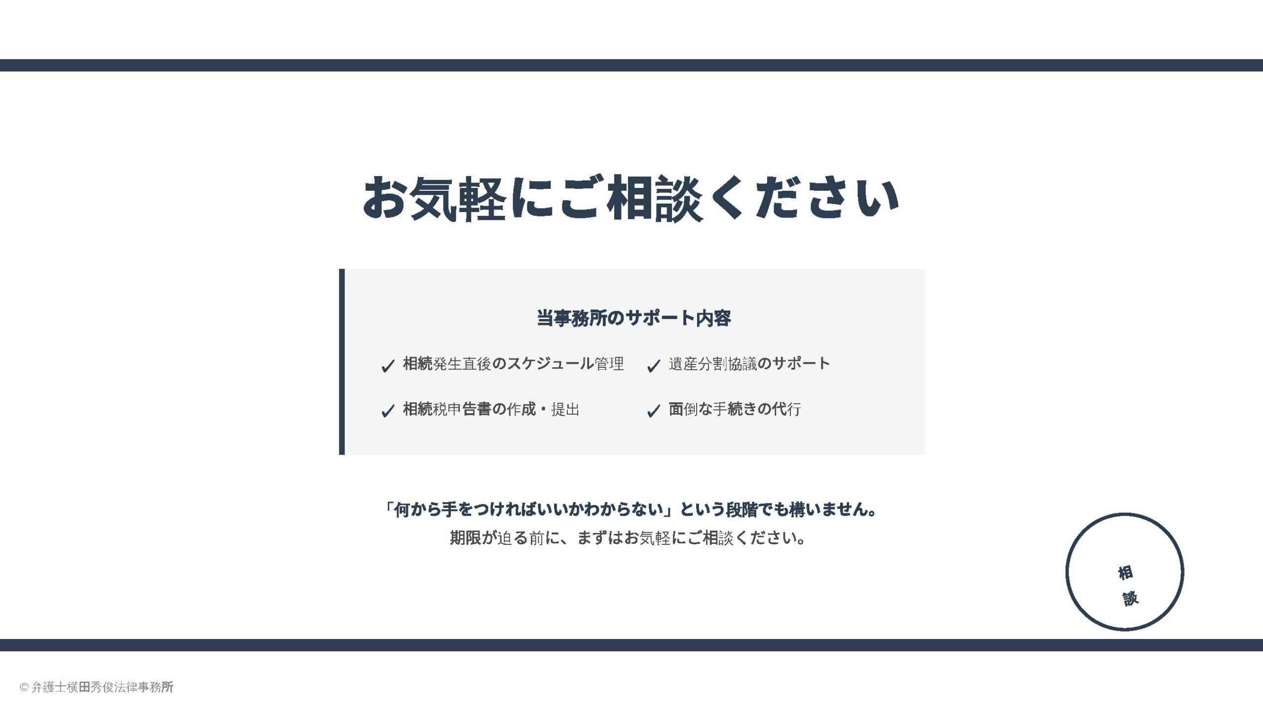 これらをすべてご遺族だけで行うのは、精神的にも実務的にも大変な負担です。特に、「親族間で揉めそうだ」「財産の種類が多い」「仕事が忙しくて手続きに行けない」という場合は、早期に専門家へ相談することで、期限切れのリスクを防ぎ、精神的な安心感を得ることができます。