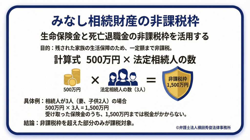 例えば、妻と子供2人が相続人の場合、500万円 × 3人 = 1500万円までは、受け取った保険金から差し引いて計算することができます。