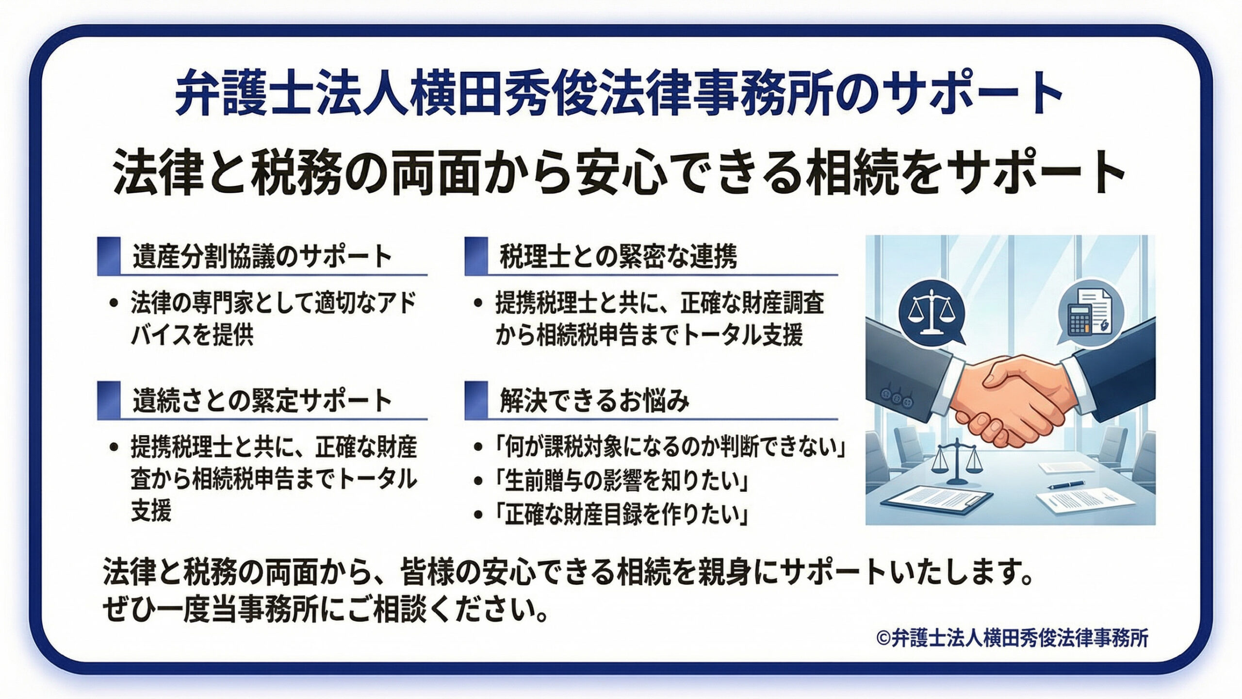 弁護士法人横田秀俊法律事務所では、遺産分割協議のサポートはもちろん、提携している税理士と緊密に連携し、相続財産の正確な調査から相続税申告までを見据えたトータルな支援を行っております。