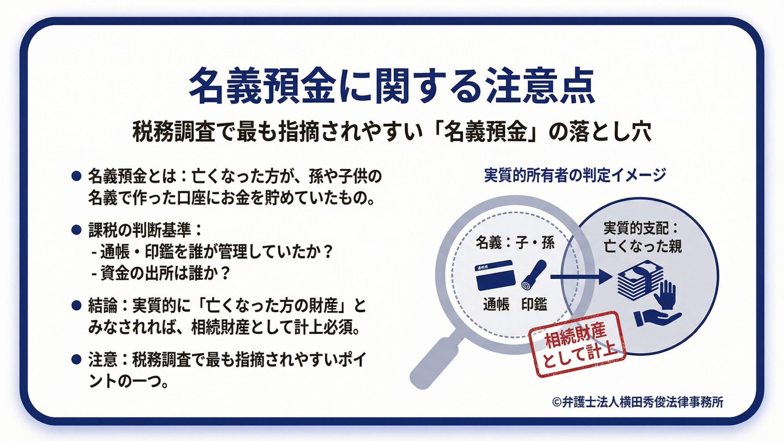 例えば、亡くなった方が、孫や子供の名前で作った通帳にお金を貯めていたとします。通帳の名義は子供でも、印鑑や通帳を亡くなった方が管理し、資金の出所も亡くなった方であれば、それは実質的に「亡くなった方の財産」とみなされ、この「本来の相続財産」として計上しなければなりません。