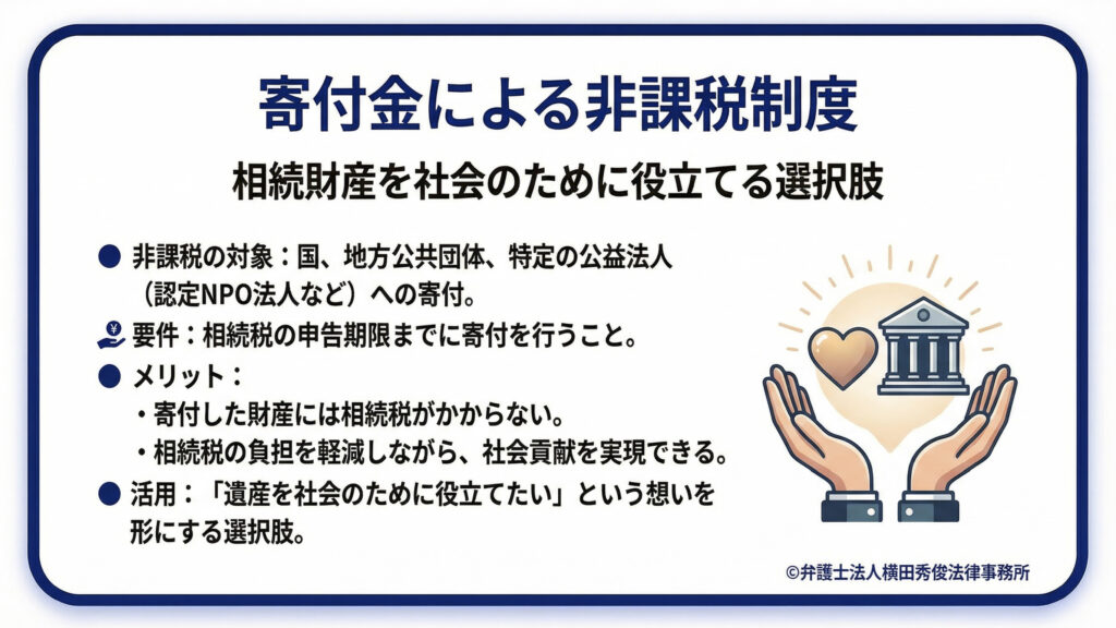 相続した財産を、相続税の申告期限までに国や地方公共団体、特定の公益法人(認定NPO法人など)に寄付した場合、その寄付した財産については相続税がかかりません。「遺産を社会のために役立てたい」という想いがある場合は、こうした制度を活用することも選択肢の一つです。