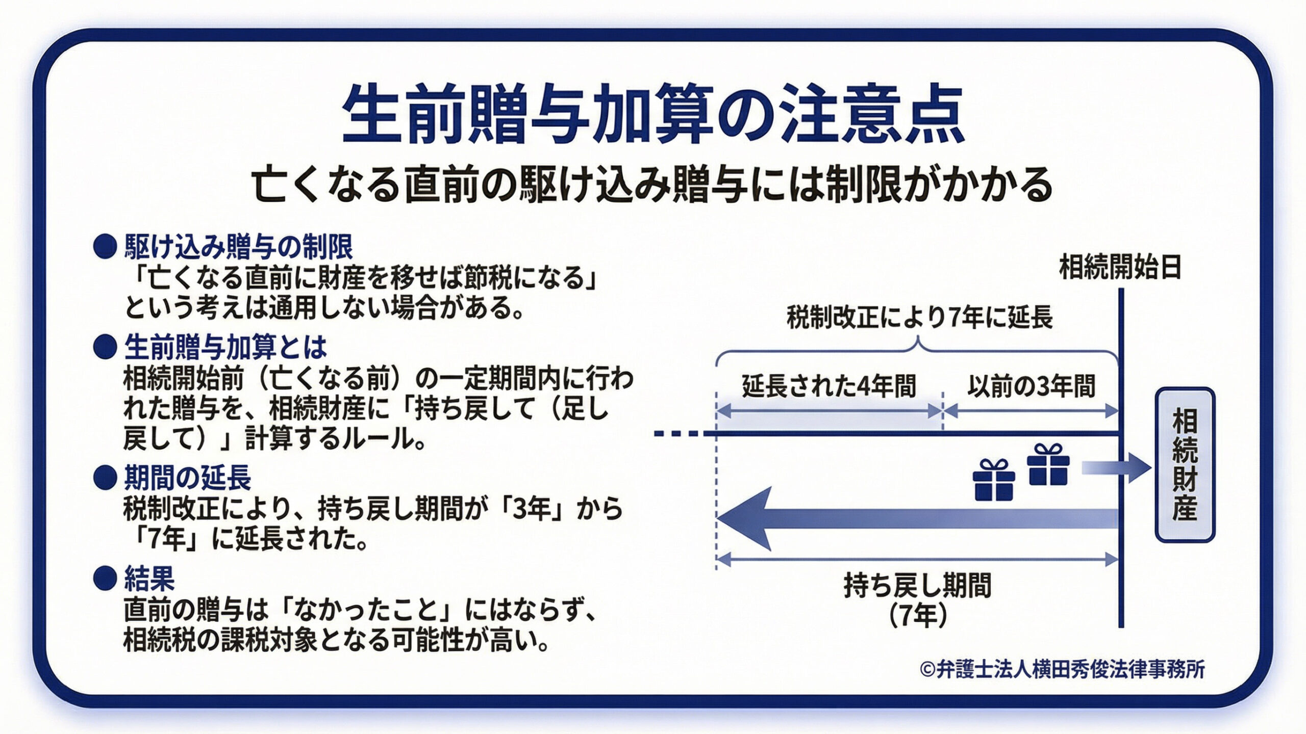 相続開始前(亡くなる前)の一定期間内に、相続人に対して行われた贈与については、相続税の計算上、亡くなった時の財産に「持ち戻して(足し戻して)」計算するというルールがあります。これを「生前贈与加算」といいます。