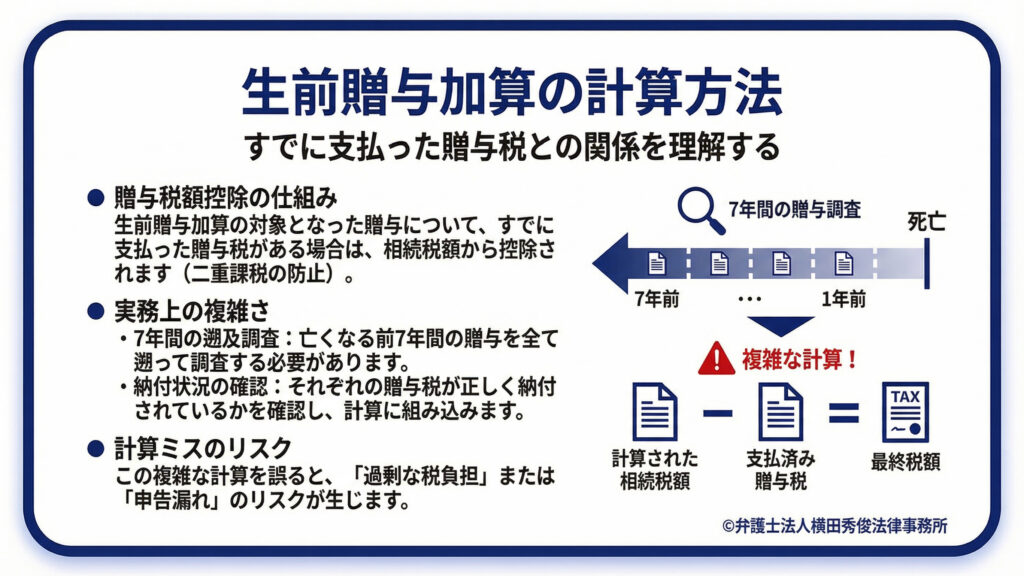 すでに支払った贈与税がある場合は、相続税額から控除されますが、計算は非常に複雑になります。