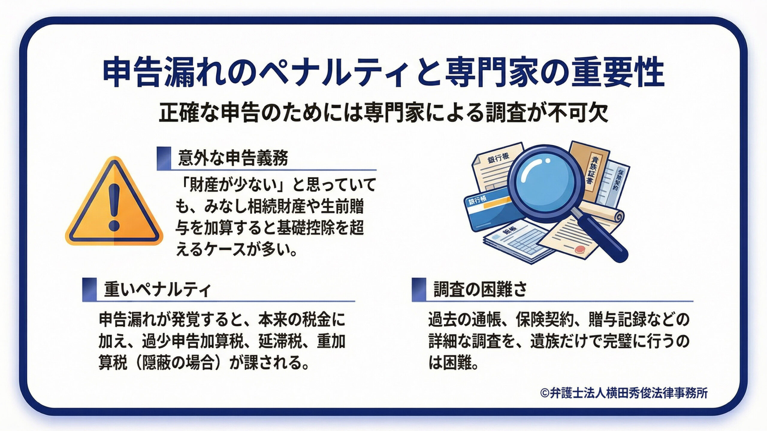 もし、申告すべき財産を漏らしてしまった場合、後から税務署の調査で指摘を受けることになります。その場合、本来納めるべき税金に加えて、過少申告加算税や延滞税といったペナルティが課されます。特に、意図的に隠したと判断された場合は、非常に重い重加算税が課されることもあります。