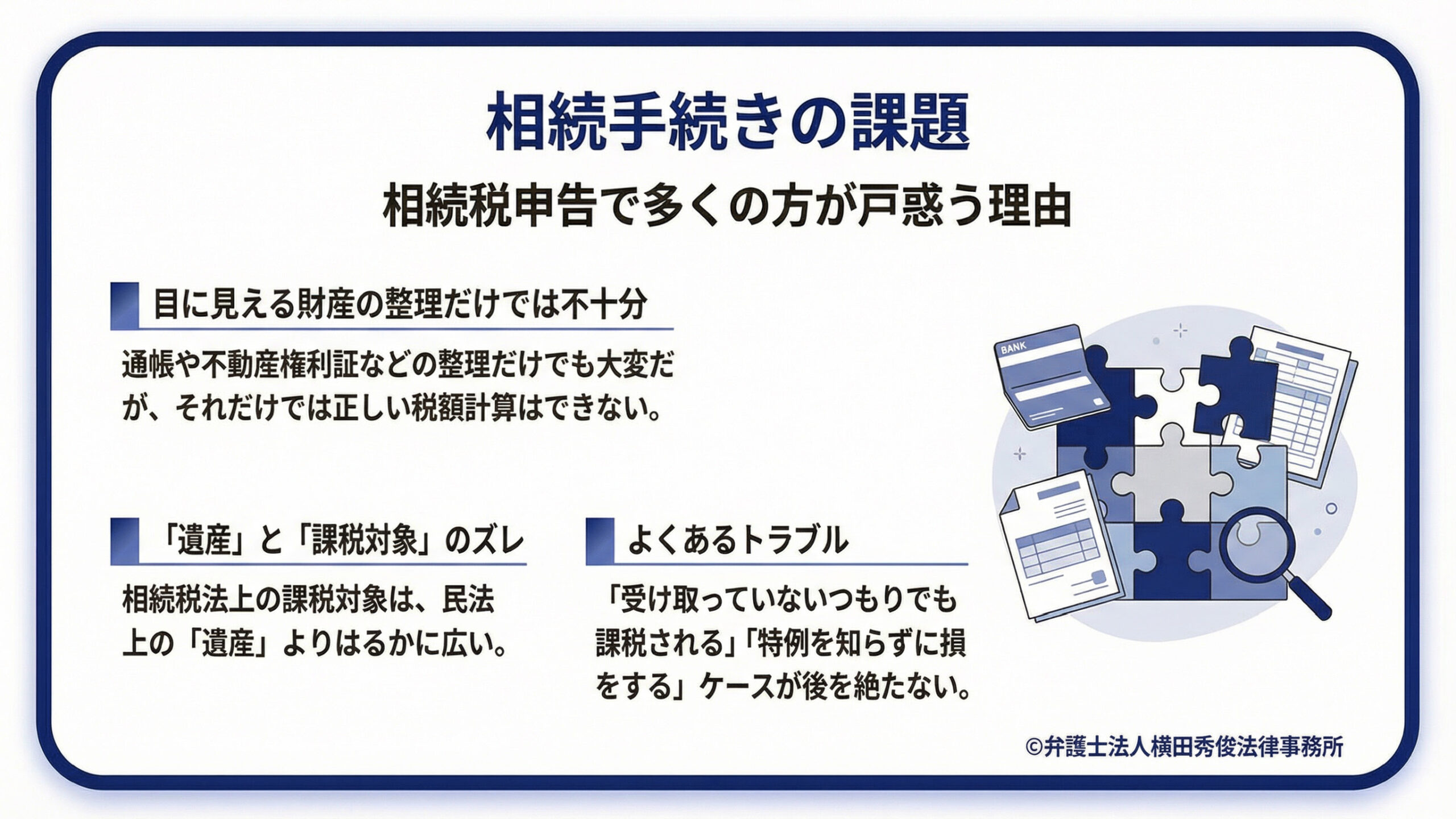 それは、「手元にある遺産だけを集計しても、正しい税額が計算できない」ということです。