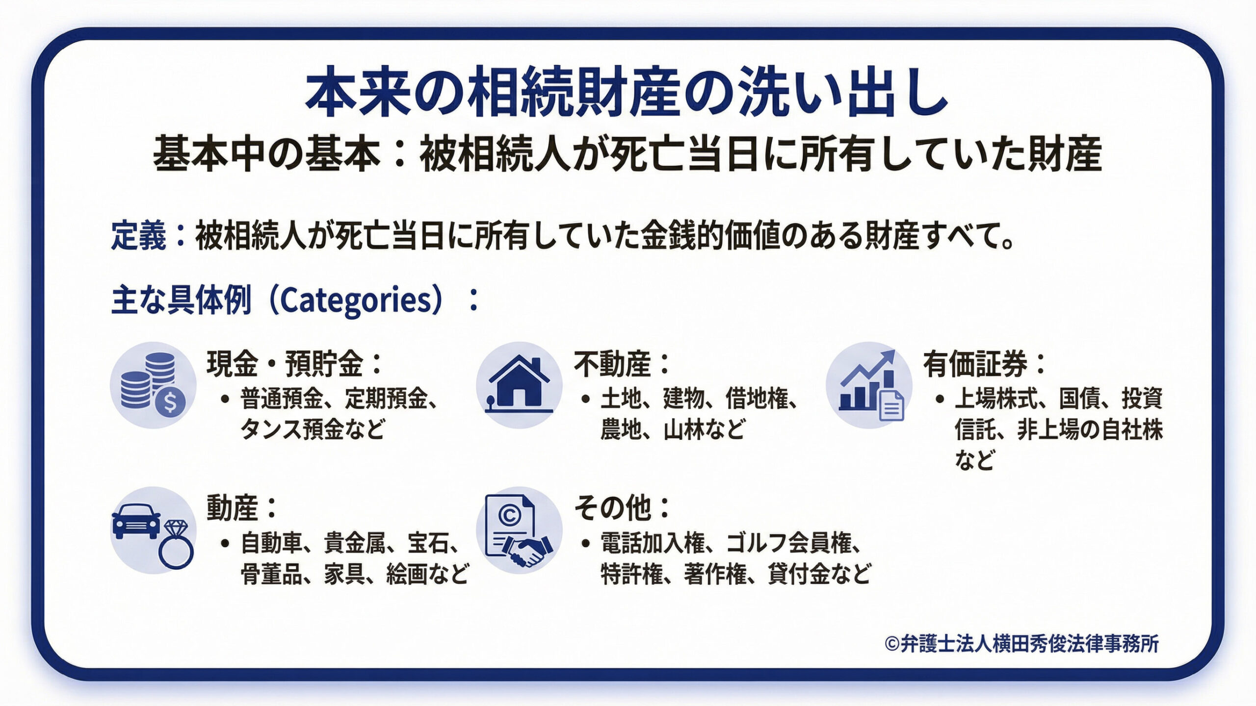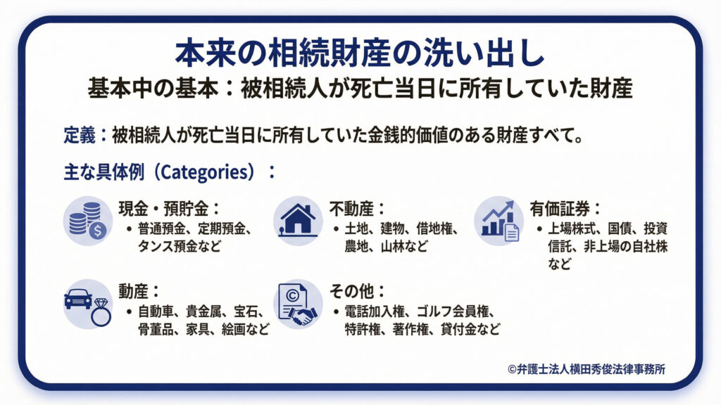 まずは、最も分かりやすい「本来の相続財産」について整理しましょう。