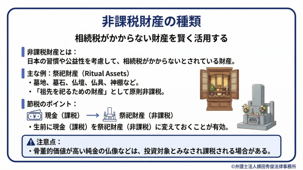 これらは「祖先を祀るための財産」として、国民感情や習慣を尊重し、原則非課税とされています。生前に自分のお墓や立派な仏壇を購入しておくことが節税になると言われるのは、現金(課税財産)が祭祀財産(非課税財産)に変わるためです。