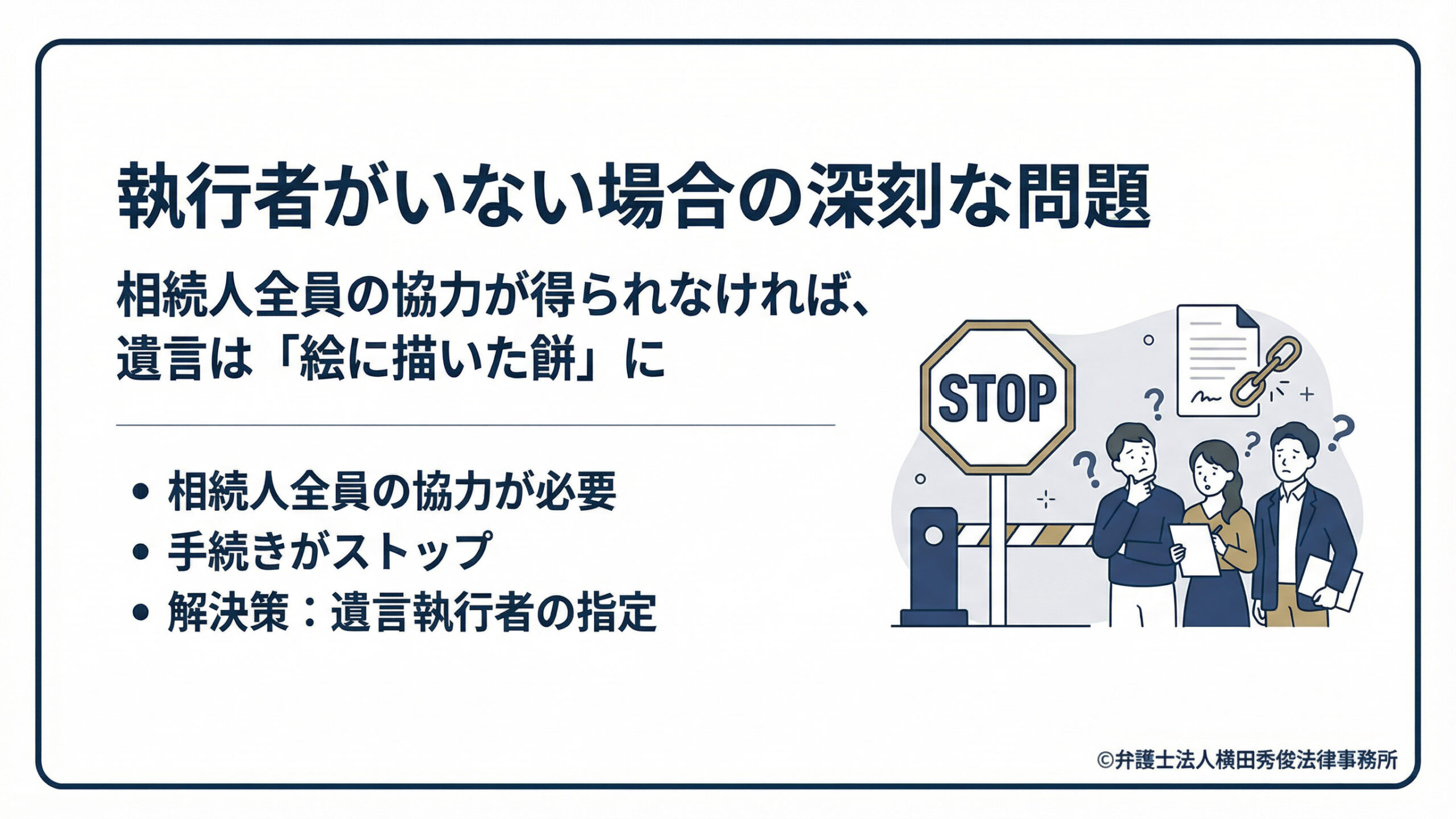 たったそれだけのことで、銀行での払い戻しや不動産の名義変更などの手続きはすべてストップしてしまいます。執行者がいなければ、遺言書があっても「絵に描いた餅」になりかねないのです。