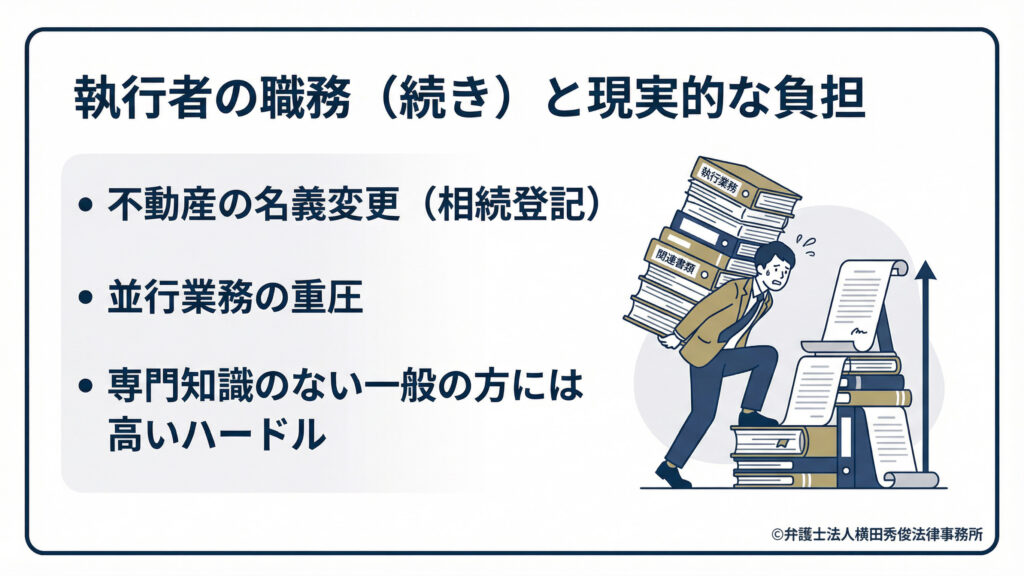 遺言書はあくまで「設計図」に過ぎません。その設計図通りに、実際に銀行口座を解約し、不動産の名義を書き換え、現金を分配する「現場監督」が必要になります。この重要な役割を担うのが「遺言執行者」です。