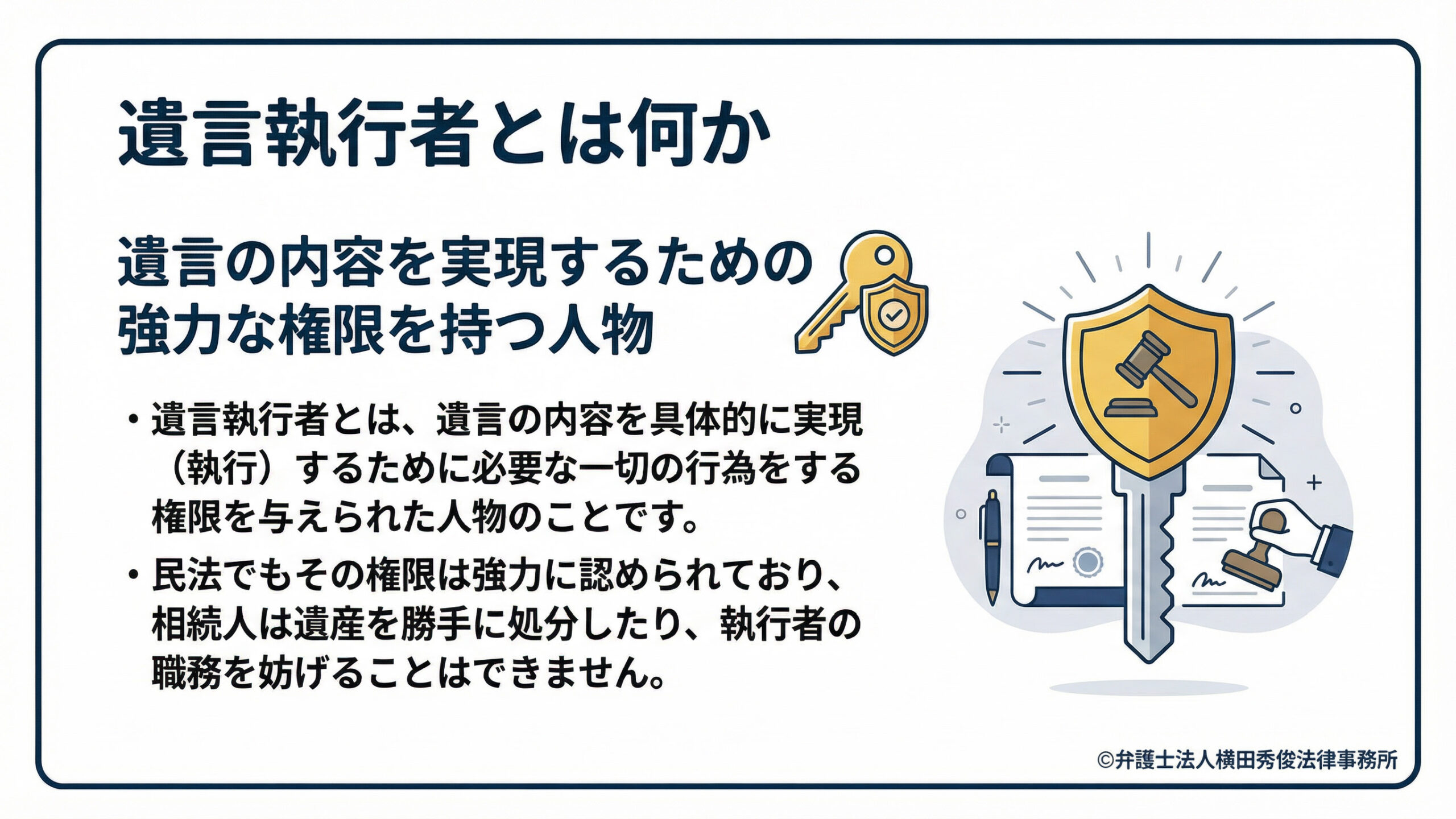 遺言執行者とは、遺言の内容を具体的に実現(執行)するために必要な一切の行為をする権限を与えられた人物のことです。
