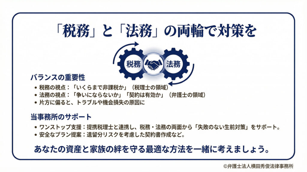 「いくらまでなら税金がかからないか」という税務の視点(税理士の領域)と、「特定の相続人に偏りすぎて争いにならないか」「契約として有効か」という法務の視点(弁護士の領域)、この両方をバランスよく検討する必要があります。