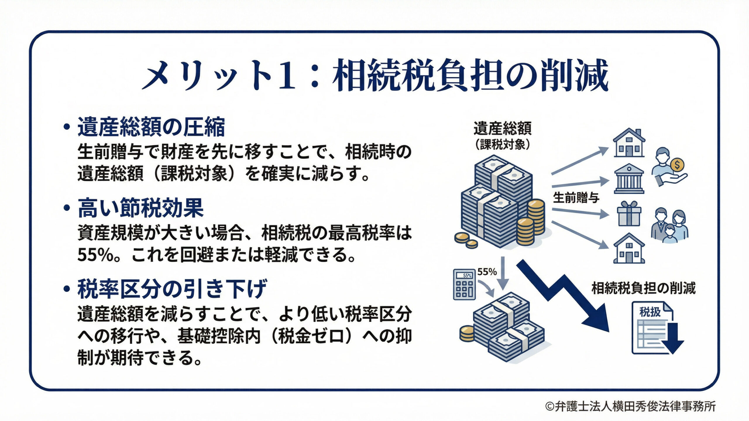特に資産規模が大きい方の場合、相続税の最高税率は55%にも達します。時間をかけて生前贈与を行い、遺産総額を圧縮することで、税率区分を下げたり、あるいは基礎控除の範囲内に収めて相続税をゼロにしたりと、極めて高い節税効果が期待できます。