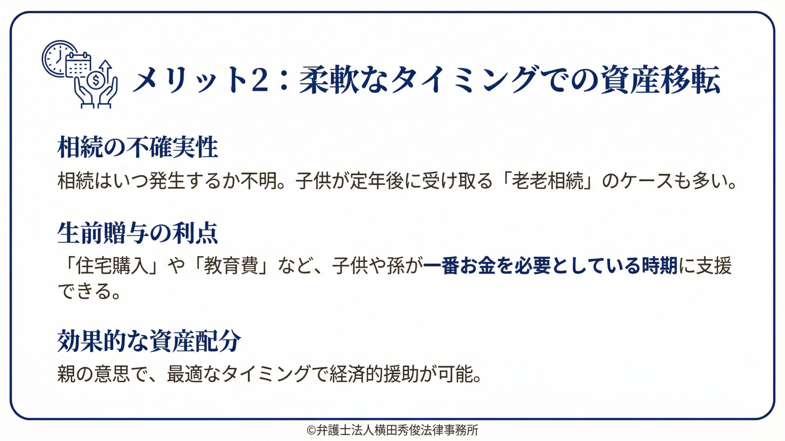その点、生前贈与であれば、親の意思で「今、支援が必要な子供や孫」に対して、好きなタイミングで財産を渡すことができます。