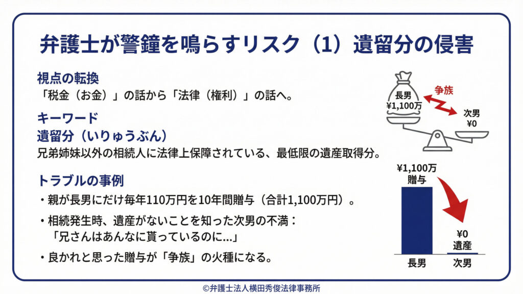ここまでは「税金(お金)」の話でしたが、ここからは私たち弁護士が専門とする「法律(権利)」の話です。実は、良かれと思って行った生前贈与が、死後の家族間トラブルの最大の原因になることがあります。