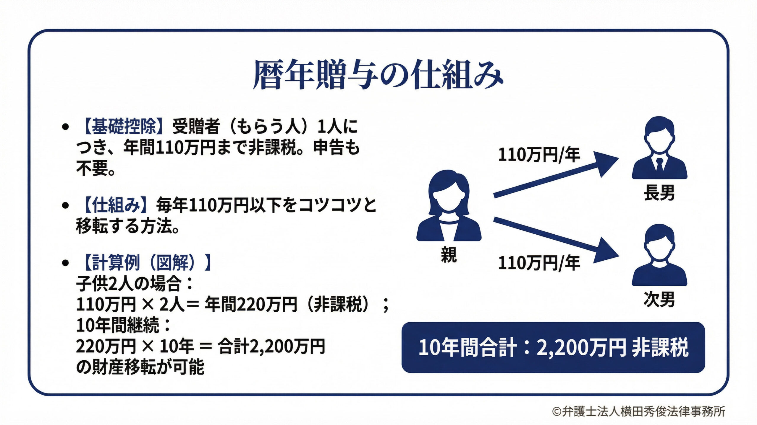 例えば、子供が2人いる場合、それぞれに毎年110万円ずつ贈与すれば、年間220万円の財産を無税で次世代に移すことができます。これを10年間続ければ、合計2,200万円もの財産を、相続税の課税対象から合法的に減らすことができるのです。