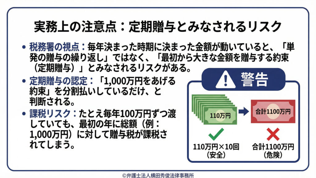 最後に、実務上の注意点として、「定期贈与(ていきぞうよ)」とみなされるリスクについても触れておきます。