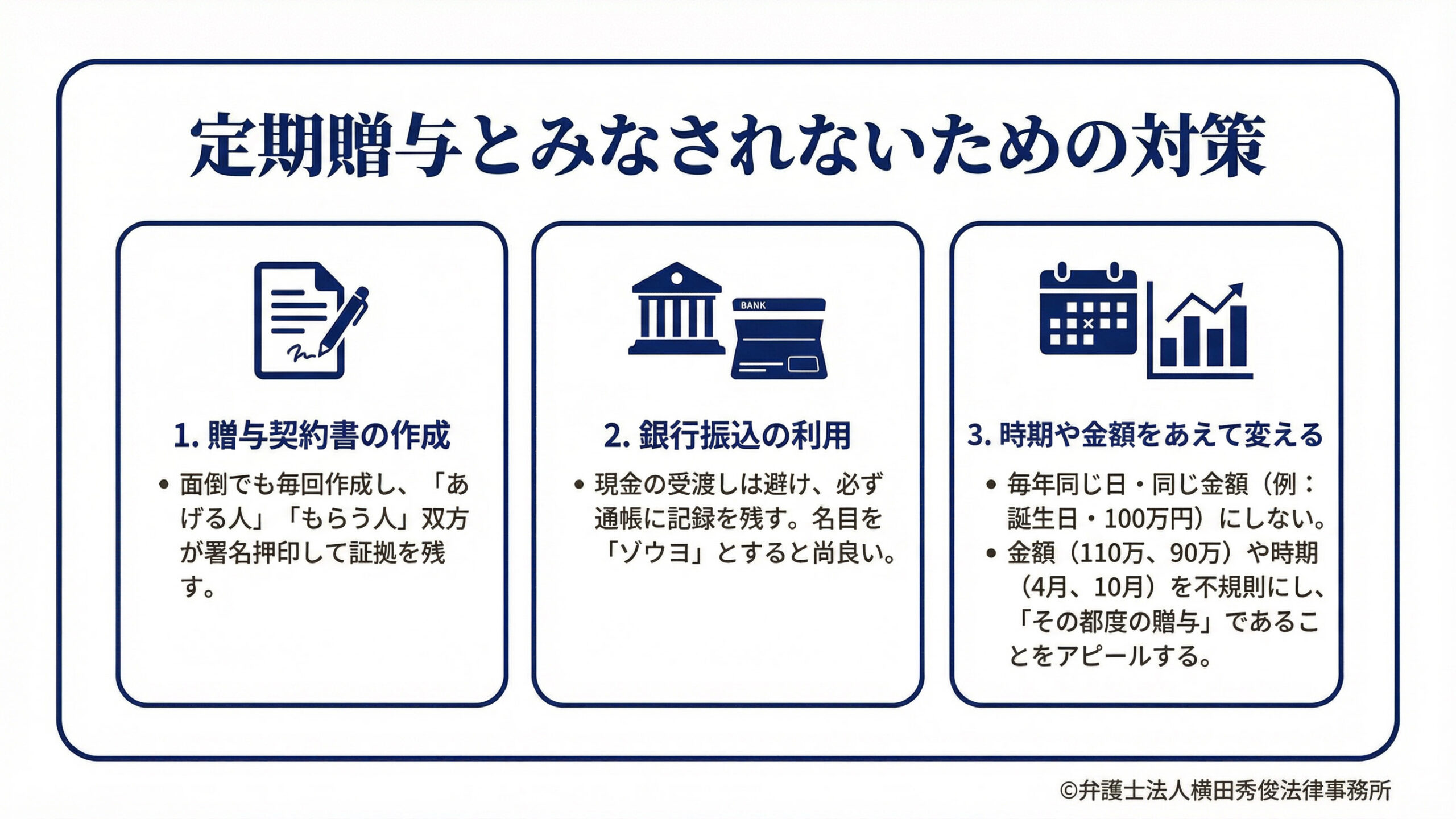 これを防ぎ、確実に暦年贈与として認めてもらうためには、以下のような工夫が必要です。