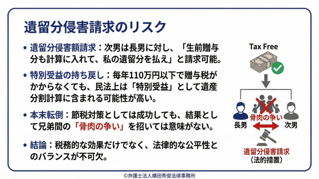たとえ「毎年110万円以下だから税金はかかっていない」としても、民法上の公平性の観点からは、その贈与は「特別受益(特別な生前利益)」とみなされ、遺産分割の計算に持ち戻される可能性が高いのです。