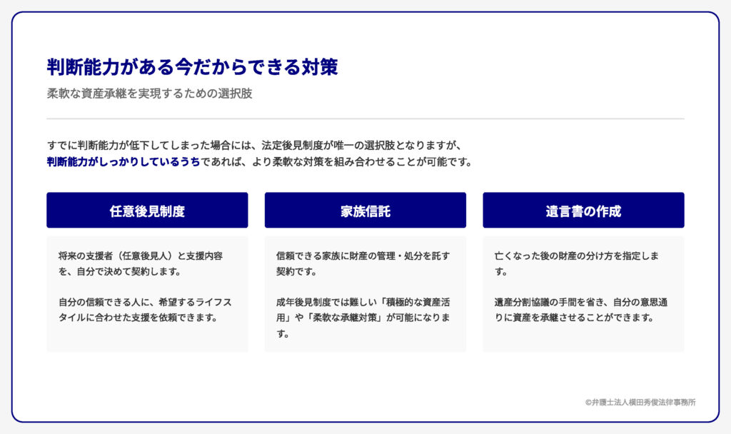 もし、ご自身やご家族が「資産の凍結」を避けつつ、積極的な資産活用や円満な資産承継を望まれるのであれば、判断能力がしっかりしているうちに、任意後見制度に加え、家族信託(民事信託)や遺言書の作成など、より柔軟な対策を検討する必要があります。