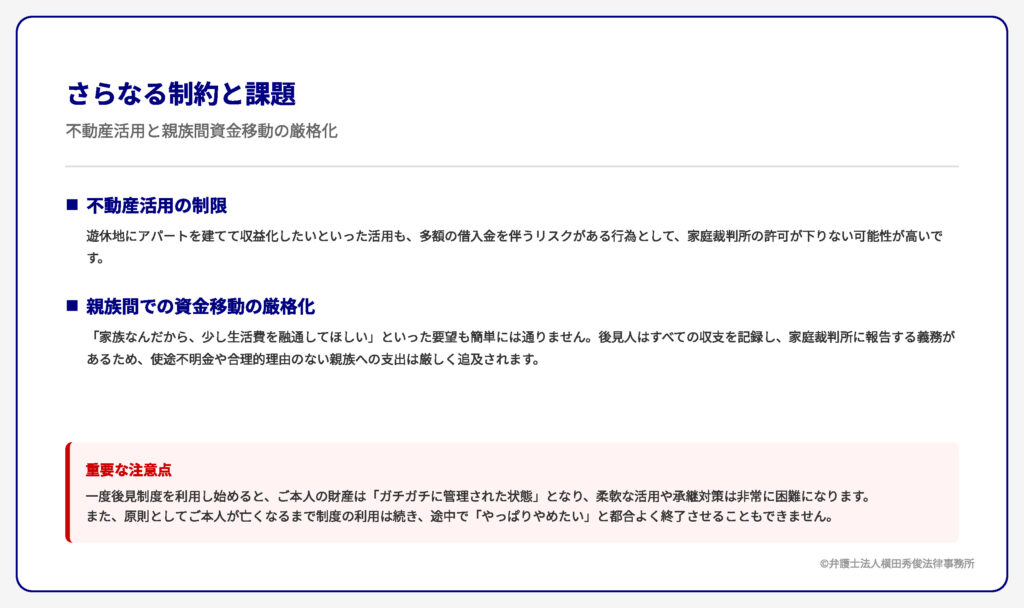 このように、一度後見制度を利用し始めると、ご本人の財産は「ガチガチに管理された状態」となり、柔軟な活用や承継対策は非常に困難になります。また、原則としてご本人が亡くなるまで制度の利用は続き、途中で「やっぱりやめたい」と都合よく終了させることもできません。