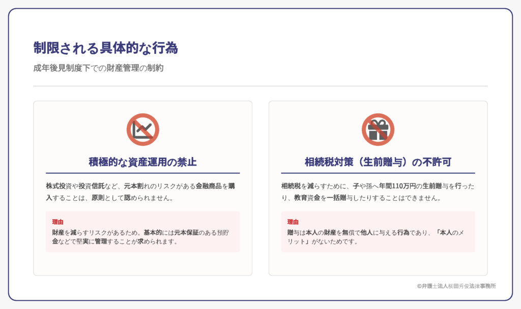 株式投資や投資信託など、元本割れのリスクがある金融商品を購入することは、財産を減らすリスクがあるため、原則として認められません。基本的には元本保証のある預貯金などで堅実に管理することが求められます。