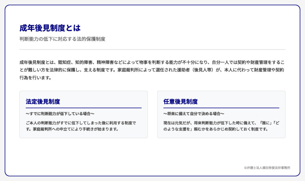 成年後見制度は、判断能力が低下した方の生活と財産を守るための「命綱」とも言える重要な制度です。