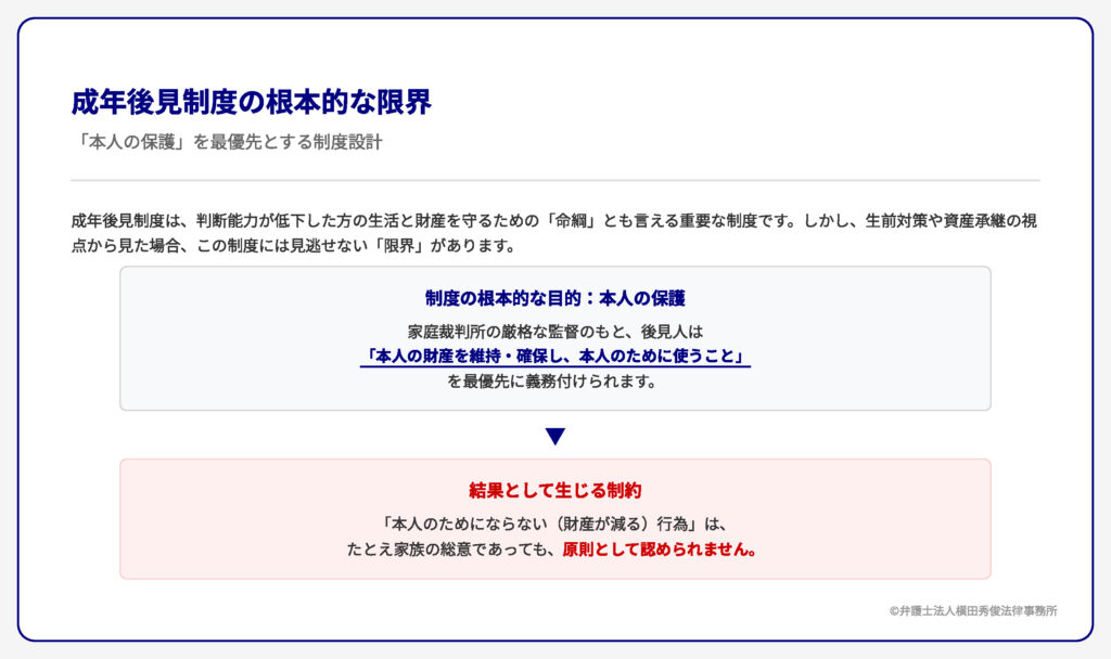 制度の根本的な目的は、あくまで「本人の保護」です。