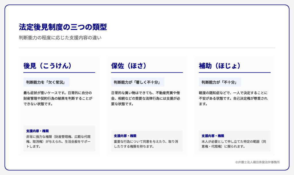 この制度は、ご本人の判断能力の程度に応じて、「後見」「保佐」「補助」の3つの類型に分かれており、それぞれ支援の内容や範囲が異なります。