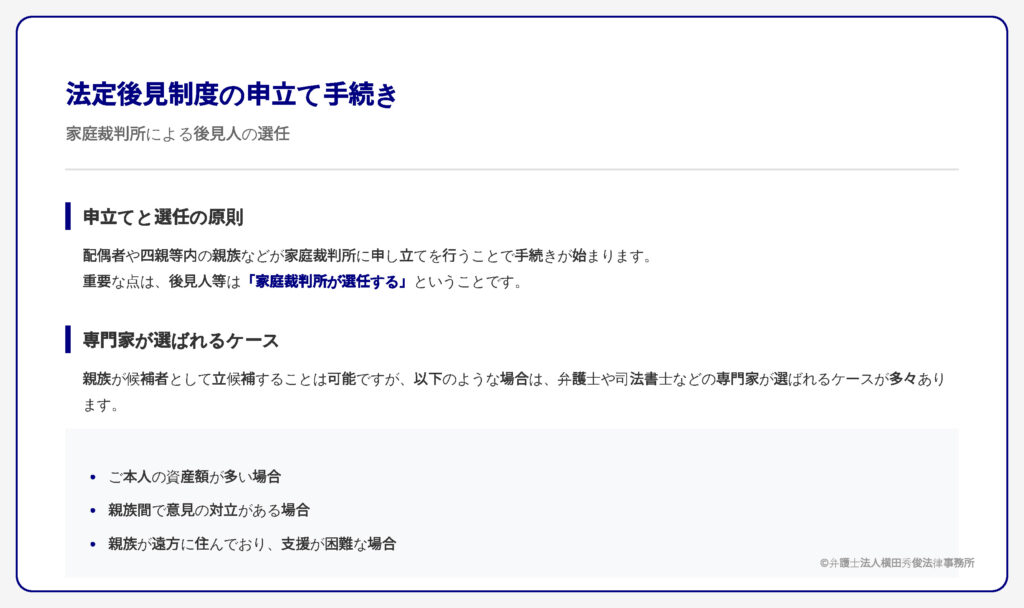 重要な点は、法定後見制度における後見人等は「家庭裁判所が選任する」ということです。