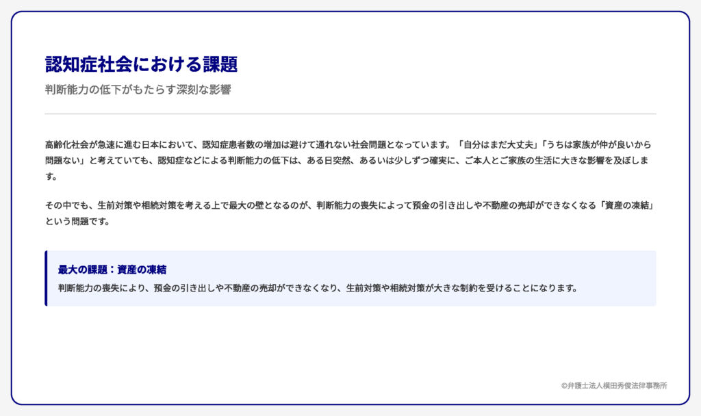 その中でも、生前対策や相続対策を考える上で最大の壁となるのが、判断能力の喪失によって預金の引き出しや不動産の売却ができなくなる「資産の凍結」という問題です。