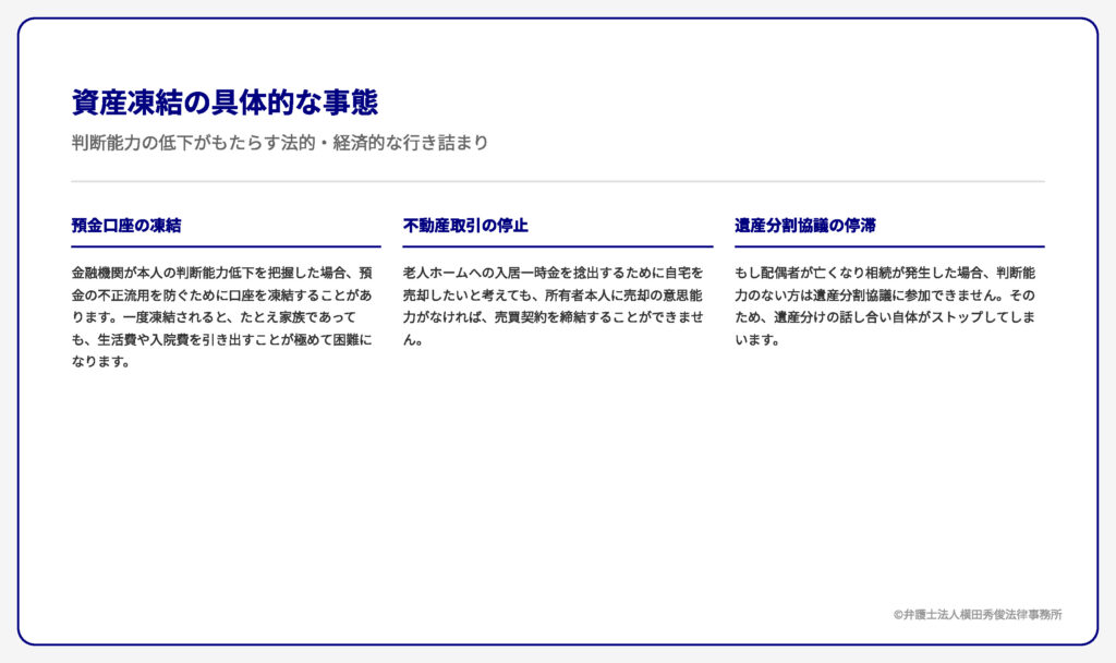 金融機関が本人の判断能力低下を把握した場合、預金の不正流用を防ぐために口座を凍結することがあります。一度凍結されると、たとえ家族であっても、生活費や入院費を引き出すことが極めて困難になります。