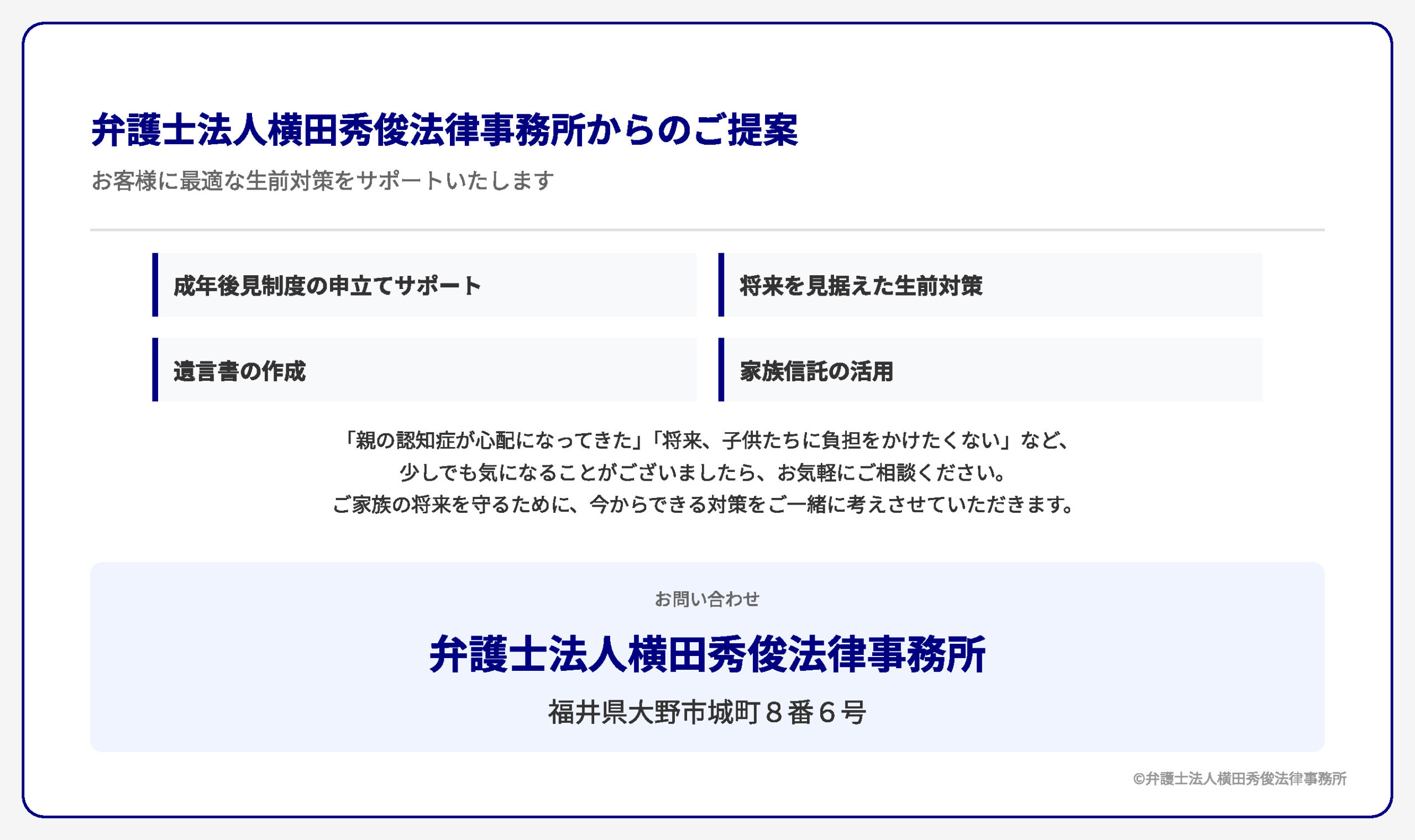 弁護士法人横田秀俊法律事務所では、成年後見制度の申立て手続きのサポートはもちろん、将来を見据えた生前対策、遺言書の作成、家族信託の活用など、お客様お一人おひとりの状況に合わせた最適なプランをご提案いたします。