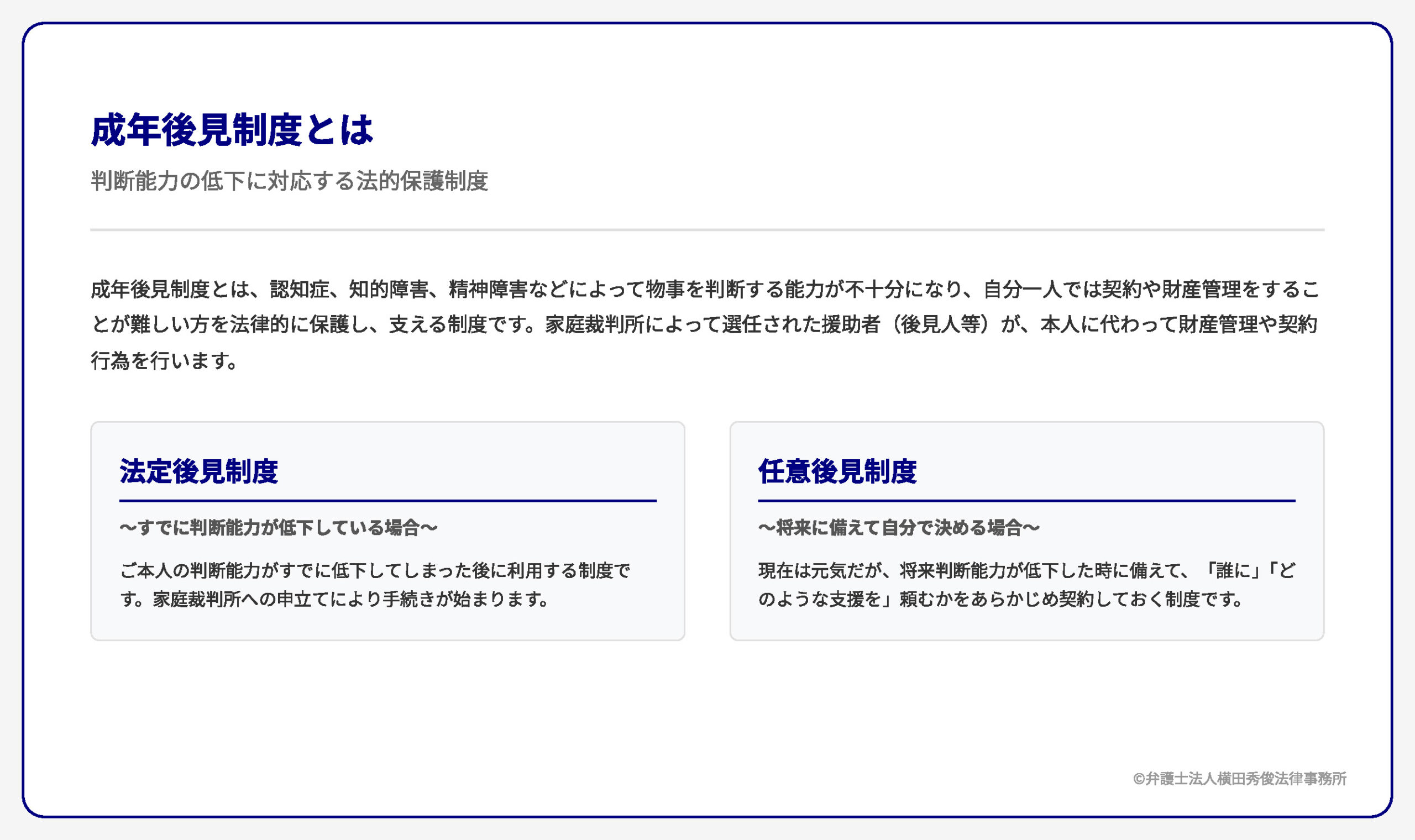 制度は大きく分けて、すでに判断能力が低下している場合に対応する「法定後見制度」と、現在は元気だが将来の不安に備えておく「任意後見制度」の2種類があります。