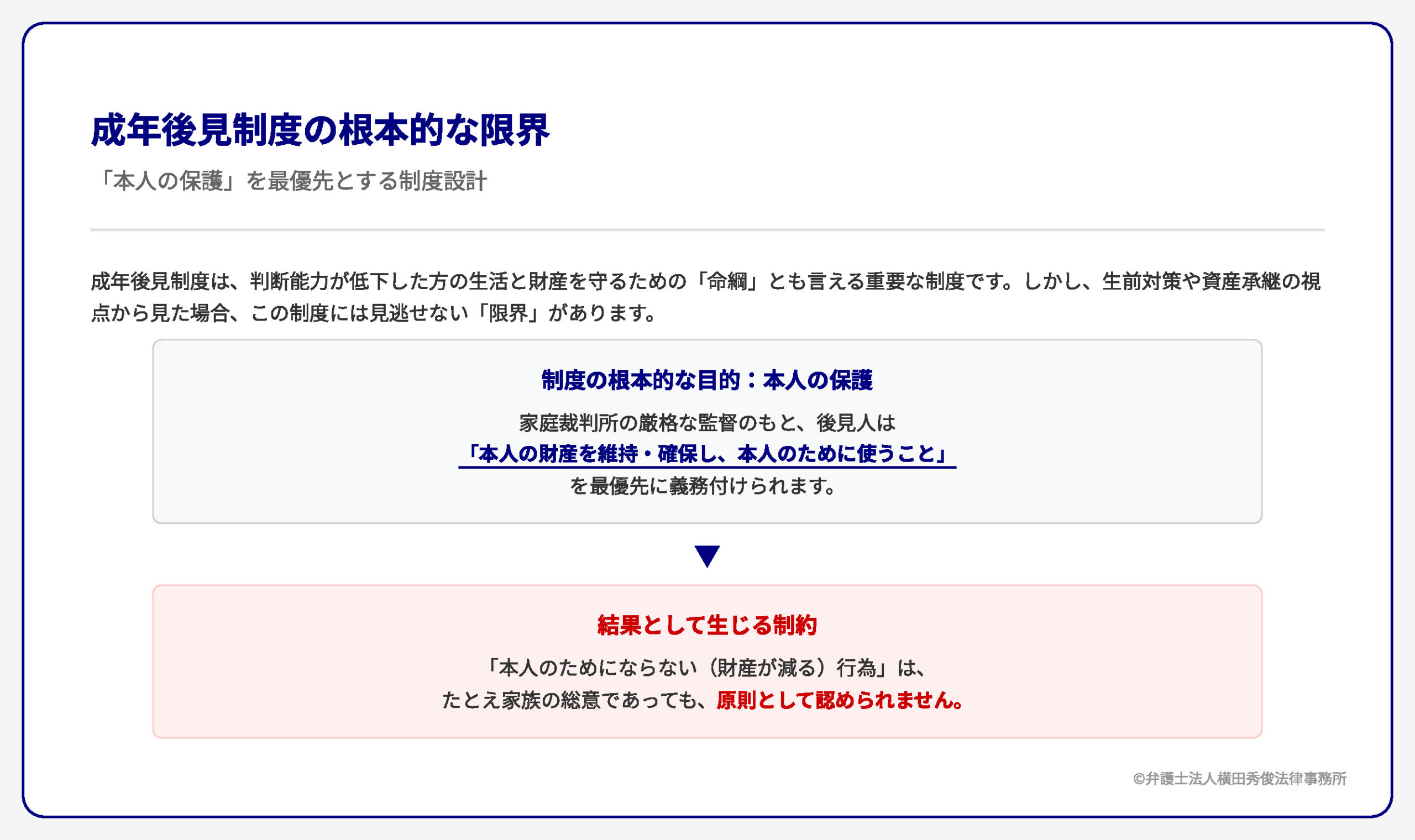 制度の根本的な目的は、あくまで「本人の保護」です。