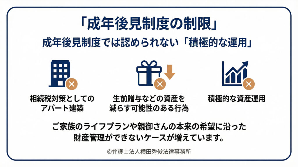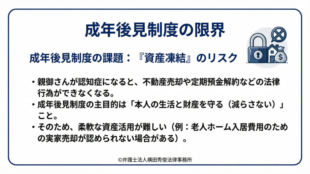 しかし、同時に成年後見制度には「本人の財産保護」が最優先されるがゆえに、ご家族が望むような資産の活用や処分が難しくなる「柔軟性の低さ」という課題があることもお伝えしました。