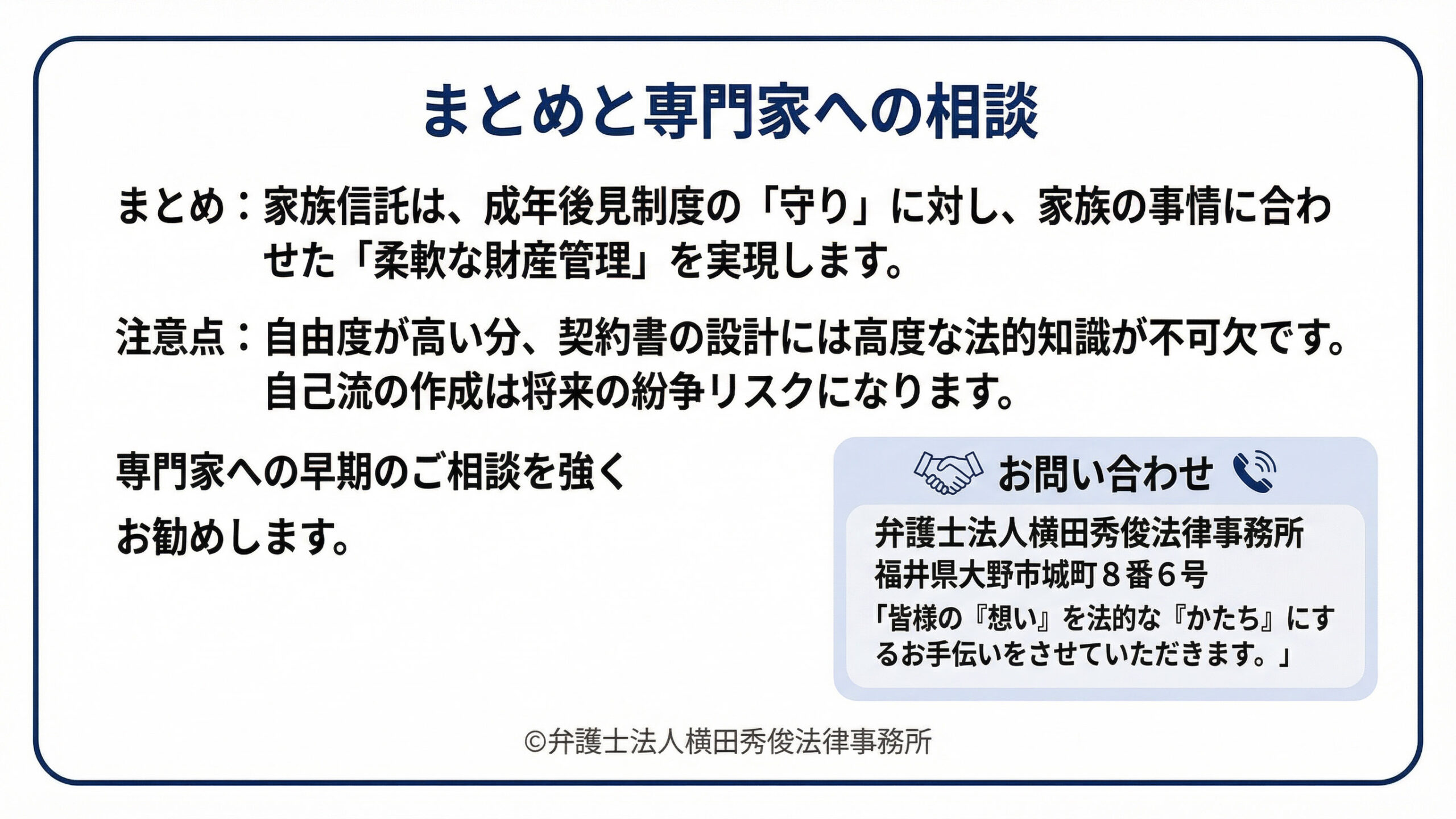 ご自身の家族構成や財産状況において、家族信託が適しているのか、あるいは他の制度と組み合わせるべきなのか、まずは専門家にご相談されることを強くお勧めします。