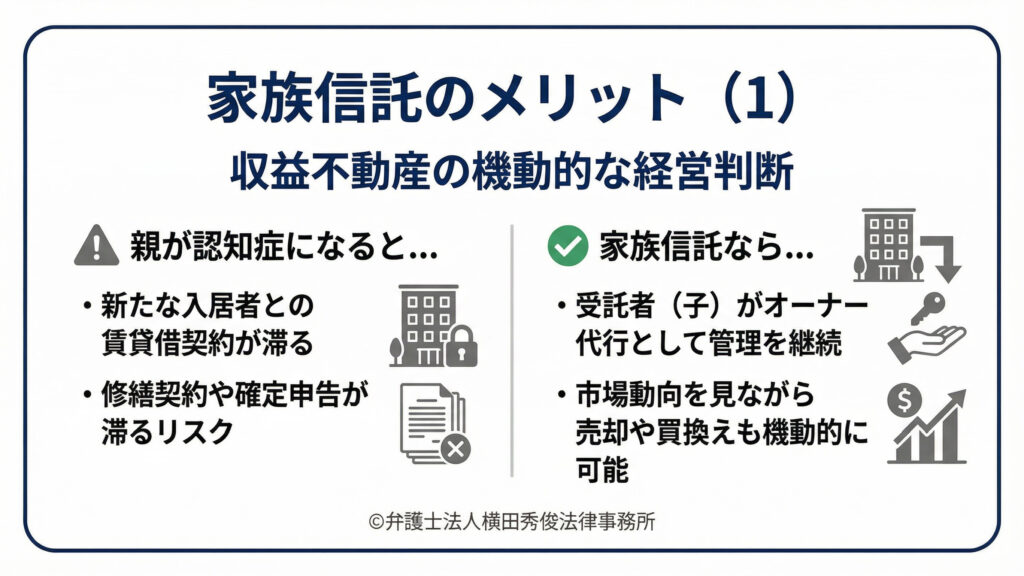 アパートや駐車場経営などをされている場合、親が認知症になると、新たな入居者との賃貸借契約、修繕契約、確定申告などが滞るリスクがあります。家族信託をしておけば、受託者である子がオーナー代行として滞りなく賃貸経営を継続でき、市場動向を見ながら適切なタイミングで物件を売却したり、買い替えたりすることも可能です。
