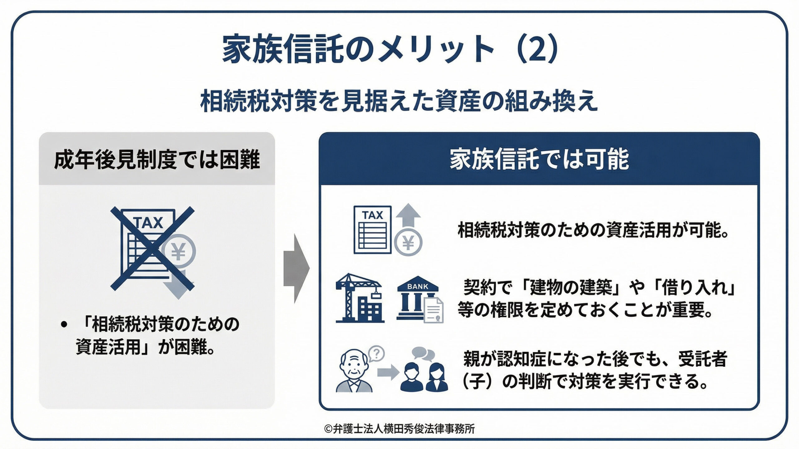 しかし、家族信託の契約の中に「受託者は資産の有効活用のために、建物の建築や借り入れを行える」といった権限をあらかじめ定めておくことで、親が認知症になった後でも、受託者である子の判断によって、相続税対策を見据えた資産の組み換えや活用を実行できる可能性があります。