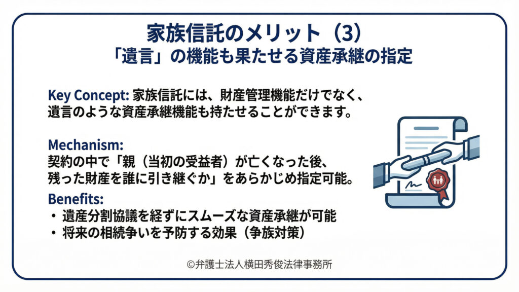 家族信託には、財産管理機能だけでなく、遺言のような資産承継機能も持たせることができます。契約の中で「親(当初の受益者)が亡くなった後、残った財産を誰に引き継ぐか」を指定できるのです。これにより、遺産分割協議を経ずにスムーズな資産承継が可能となり、将来の相続争いを予防する効果も期待できます。