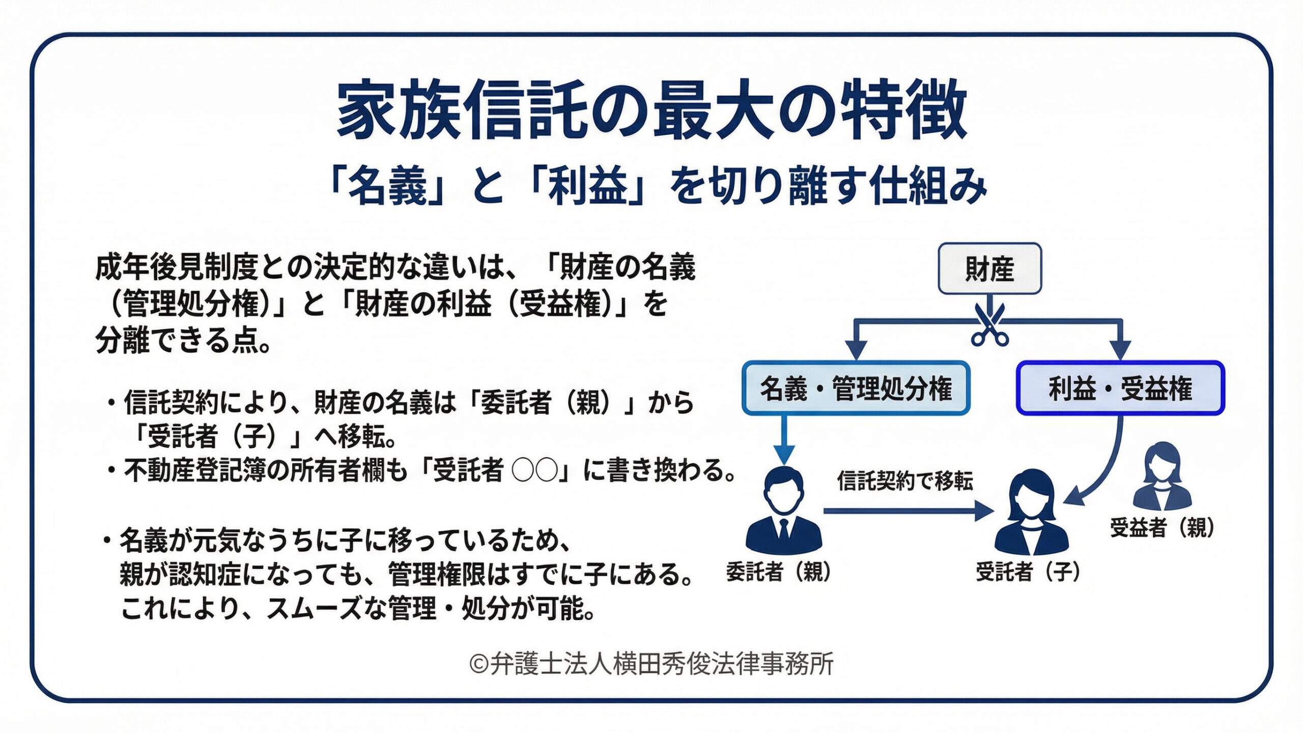 家族信託の最大の特徴であり、成年後見制度との決定的な違いは、「財産の名義(管理処分権)」と「財産の利益(受益権)」を切り離す点にあります。