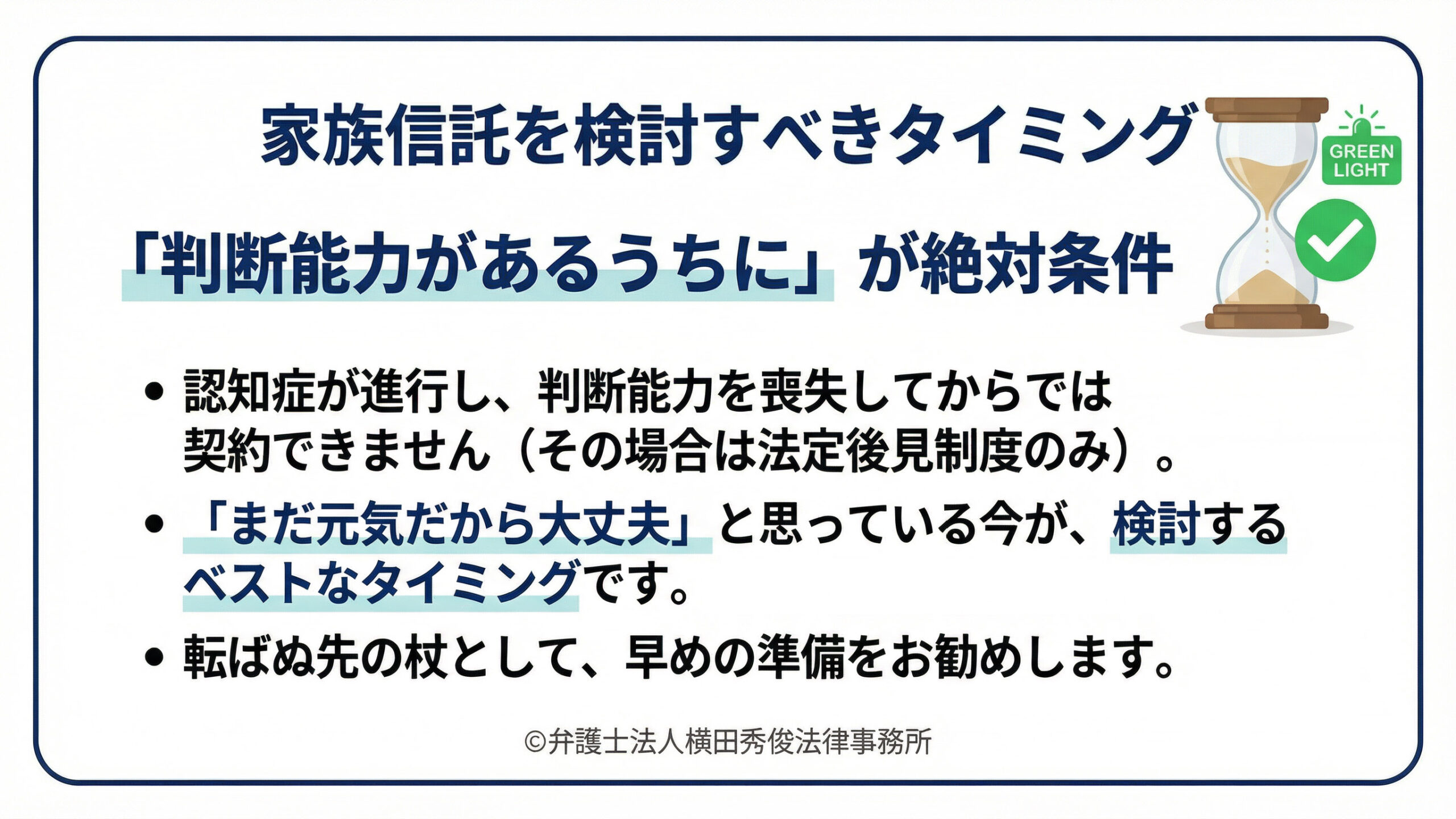「まだ元気だから大丈夫」と思っているうちが、家族信託を検討するベストなタイミングです。転ばぬ先の杖として、あるいはご家族で将来のお金の話をするきっかけとして、早めの準備をお勧めします。