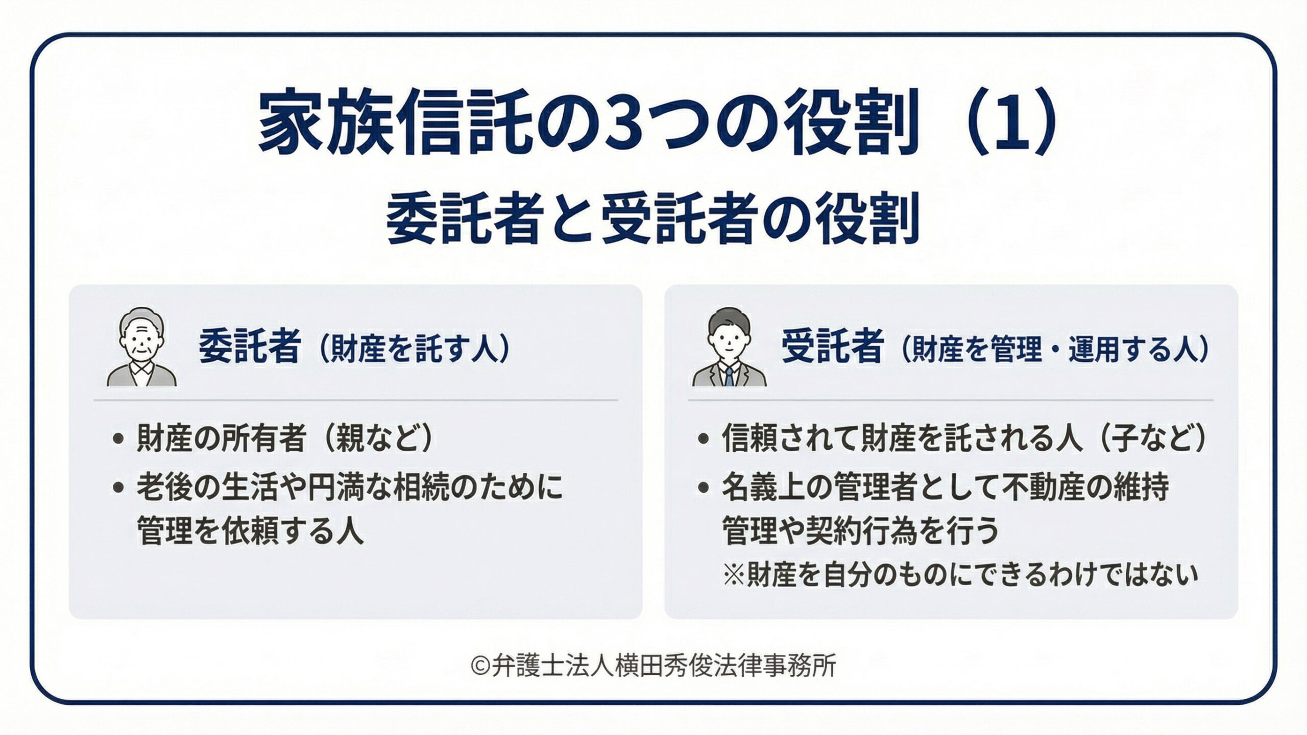 家族信託とは、一言で言えば「判断能力があるうちに、信頼できる家族(主に子)に財産の管理・処分権限を託す契約」のことです。この仕組みを理解するためには、以下の3つの登場人物とその役割を把握することが重要です。