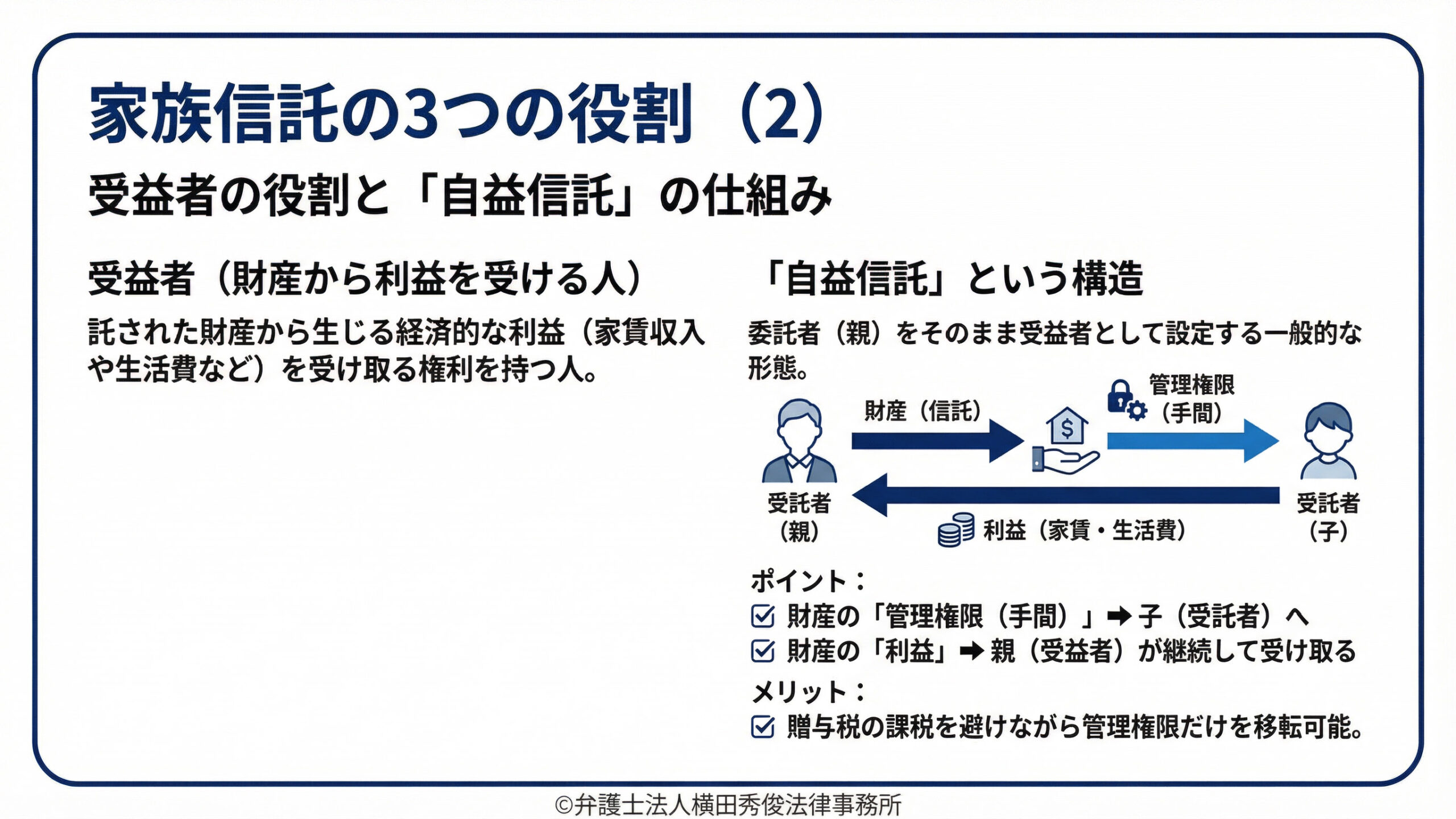 託された財産から生じる経済的な利益(家賃収入や、生活費としての給付など)を受け取る権利を持つ人です。 家族信託では、多くの場合、委託者である親をそのまま受益者として設定します(自益信託といいます)。つまり、財産の管理権限という「手間」は子に移し、その財産から生まれる「利益」は引き続き親が受け取るという構造にするのです。これにより、贈与税の課税を避けながら管理権限だけを移転させることができます。