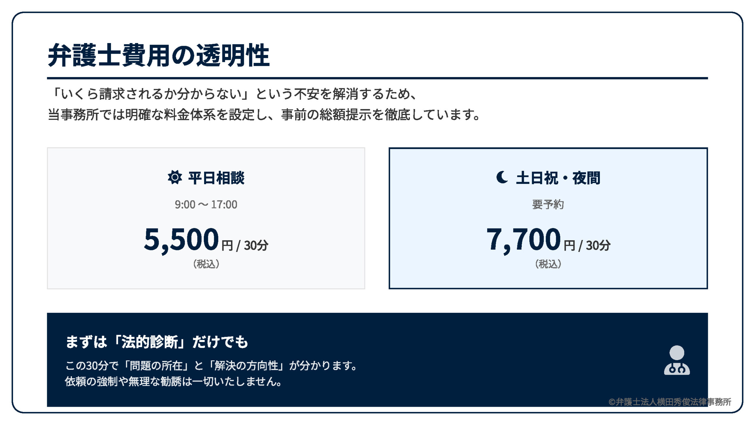 こうした「費用の不透明さ」が、相談への第一歩を阻む大きな壁になっていることを、私たちは理解しています。