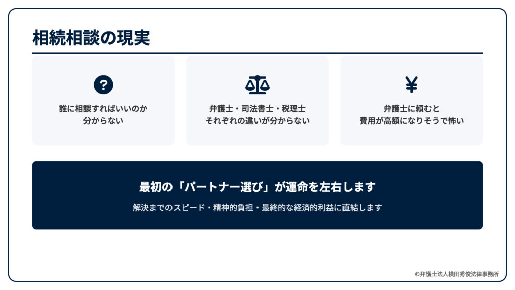 しかし、ここで「誰をパートナーに選ぶか」という最初の選択が、その後の解決までのスピード、精神的な負担、そして最終的に手にする経済的利益を大きく左右します。