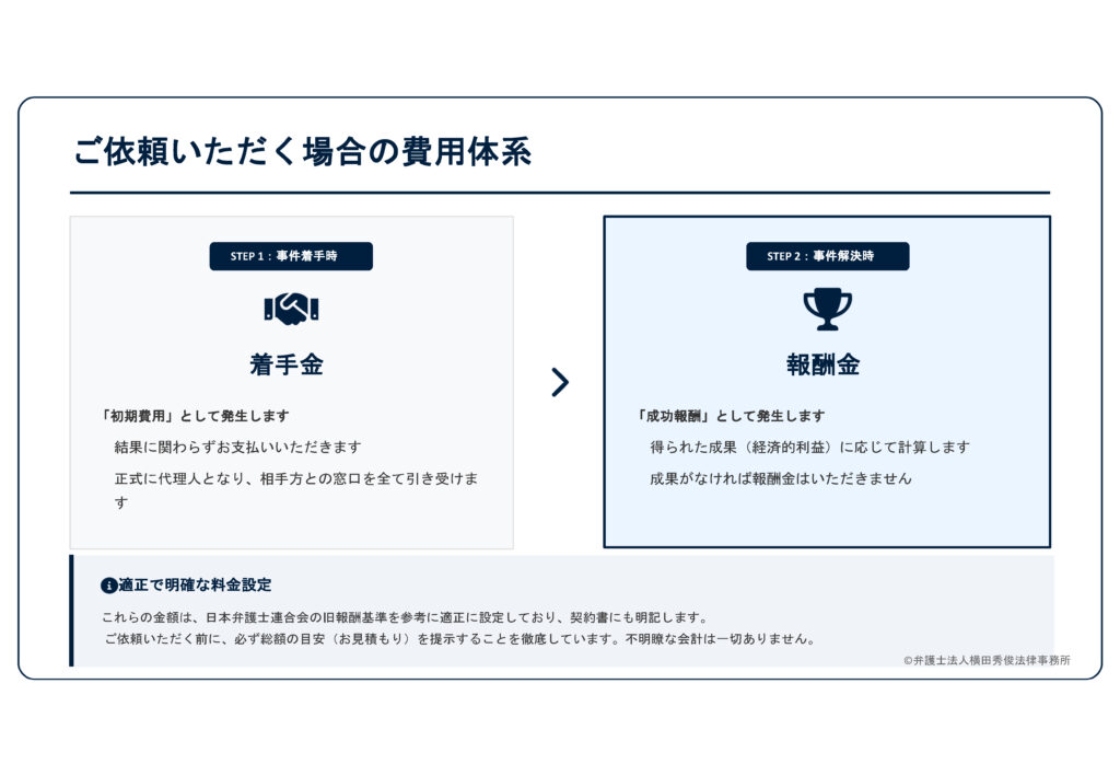 ● 着手金:事件に着手する際にお支払いいただく「初期費用」です。結果に関わらず発生しますが、これによって私たちは正式にあなたの代理人となり、相手方との窓口をすべて引き受けます。