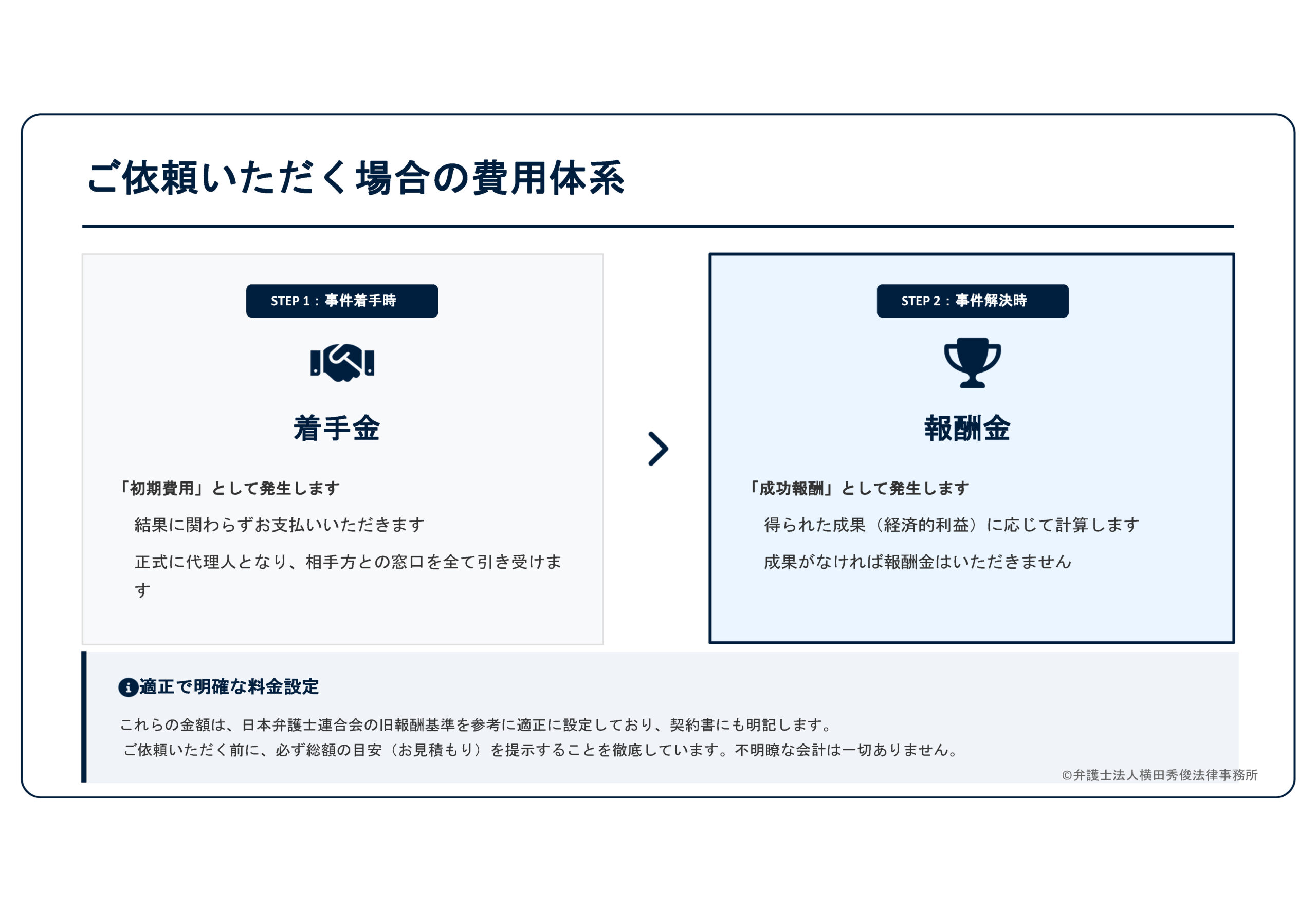 ●報酬金:事件が解決した際に、得られた成果(経済的利益)に応じてお支払いいただく「成功報酬」です。もし全く成果が得られなければ、報酬金はいただきません。