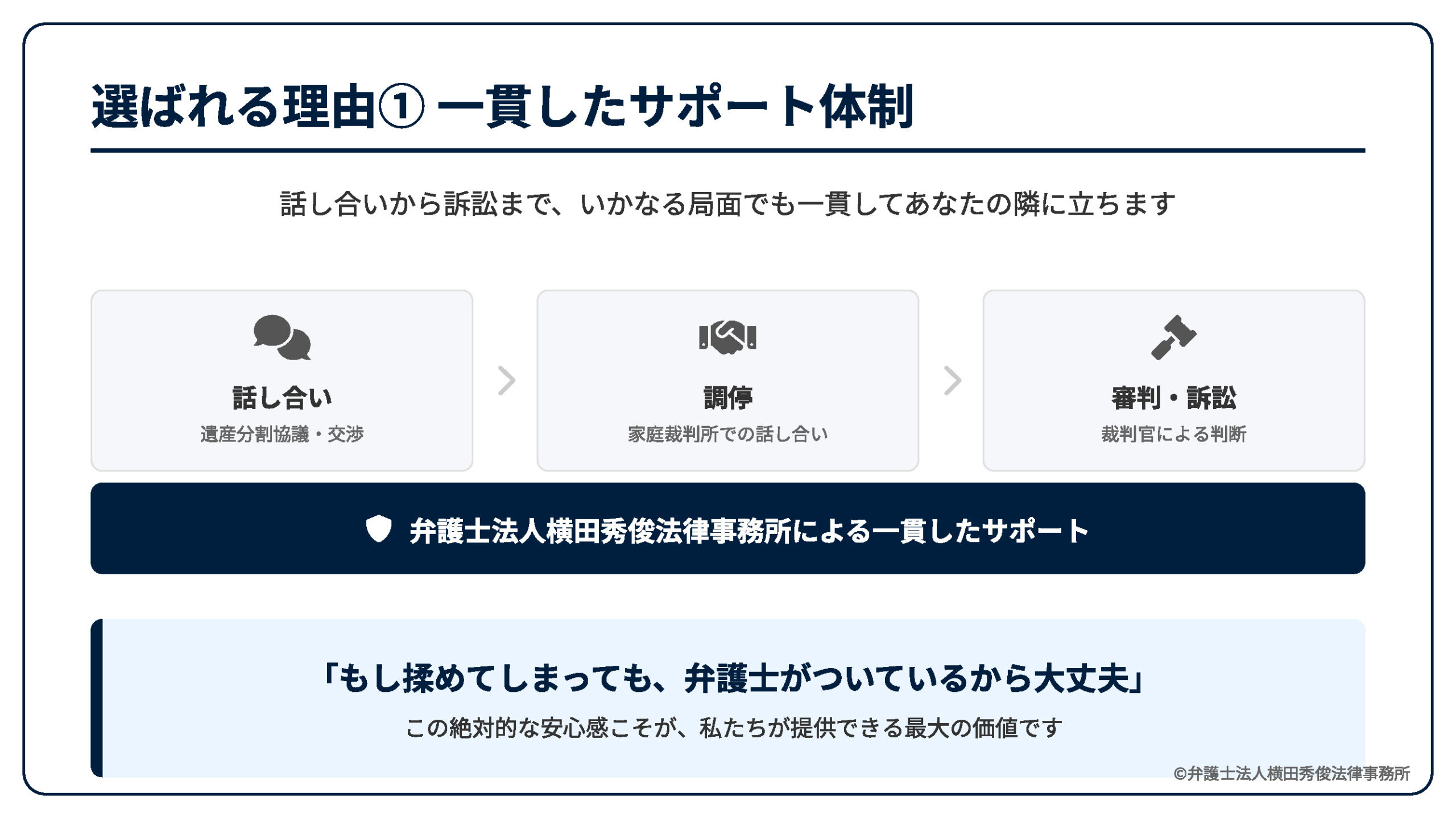 私たちは違います。話し合いの段階から、調停、審判、そして訴訟に至るまで、いかなる局面になっても一貫してあなたの隣に立ち、盾となり矛となって戦います。「もし揉めてしまっても、弁護士がついているから大丈夫」という絶対的な安心感。