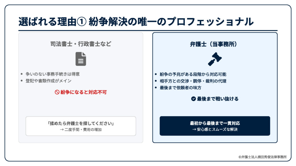 当事務所が選ばれる最大の理由は、こうした「紛争」や「トラブル」の予兆がある案件において、最初から最後まで依頼者様の「代理人」として戦える点にあります。