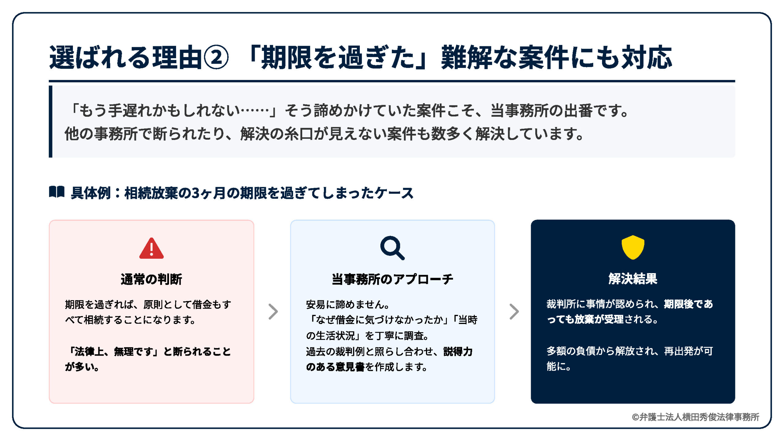 選ばれる理由2:「期限を過ぎた」「複雑すぎる」難解な案件にも逃げずに対応